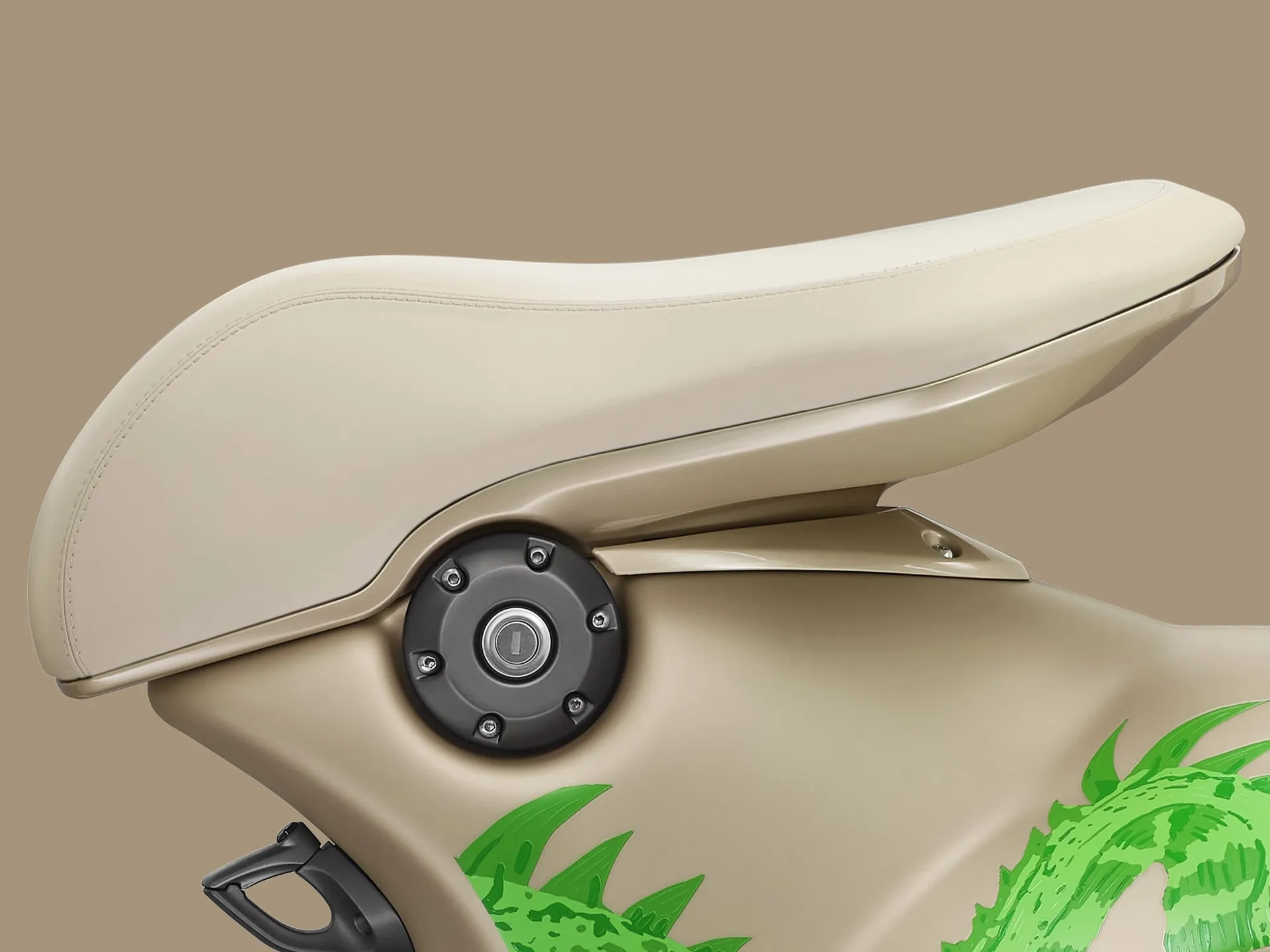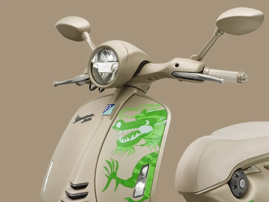 Uma mistura de acabamentos brilhantes e foscos é adornada com um vívido motivo de dragão verde que parece saltitar pelo chassi dourado, criando um contraste ousado. Numerais no estilo universitário americano, representando os anos em que o calendário lunar celebra o dragão, tornam cada scooter ainda mais única.